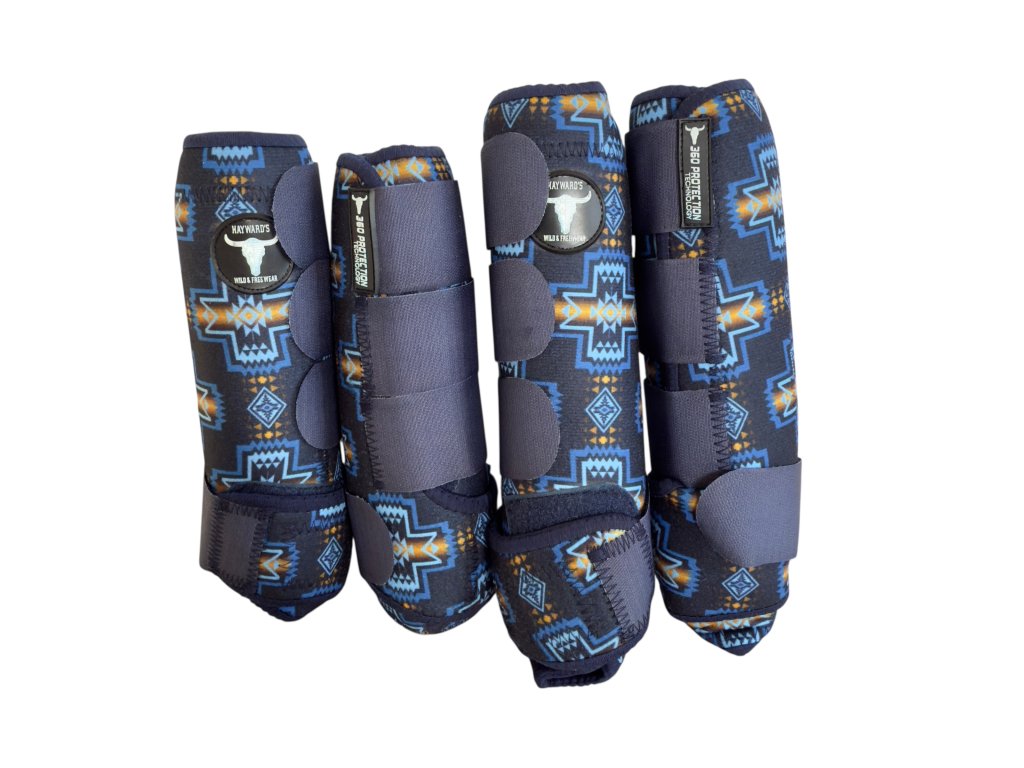 Westernové kloubové chrániče Hayward’s Indiana – sada 4 ks v modro-oranžovém aztéckém designu. Styl, pevnost a ochrana pro každý trénink.