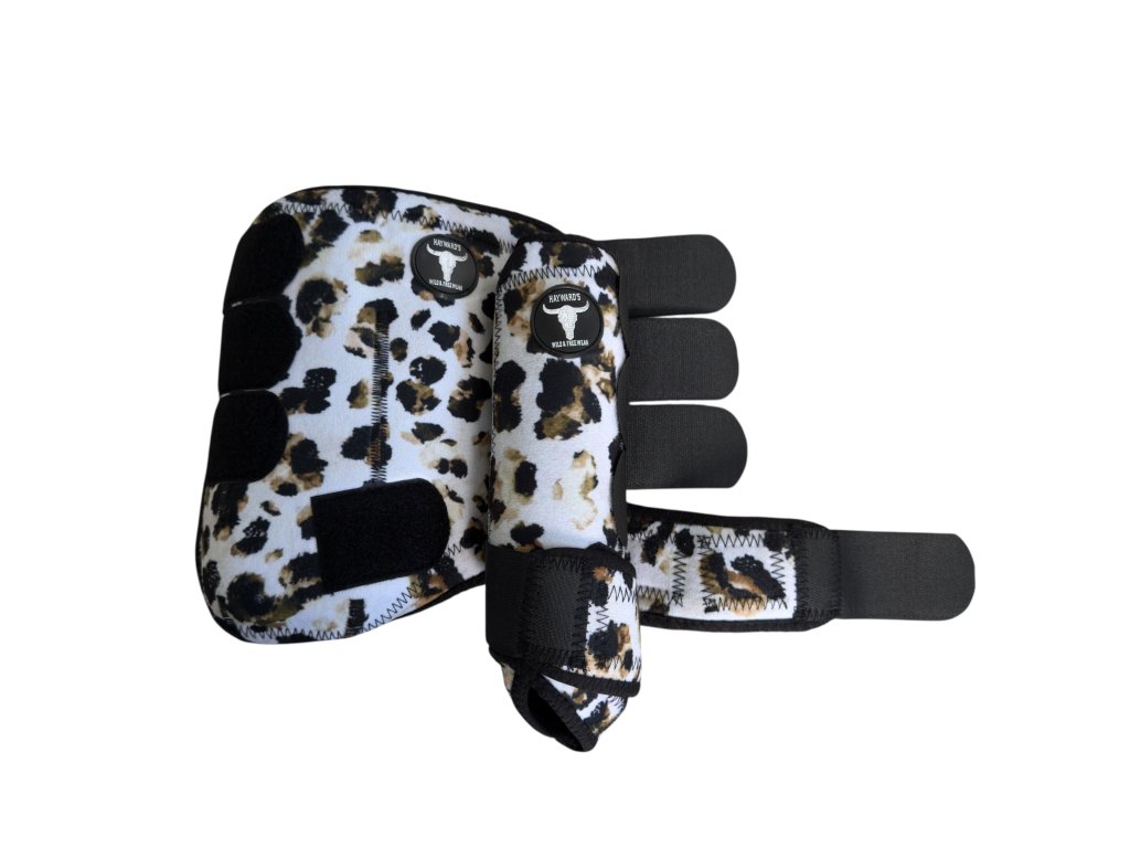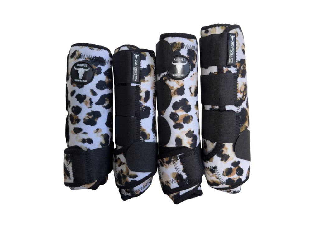 Westernové kloubové chrániče Hayward’s WildCat – sada 4 ks s výrazným leopardím vzorem. Styl, odvaha a kompletní ochrana koně.