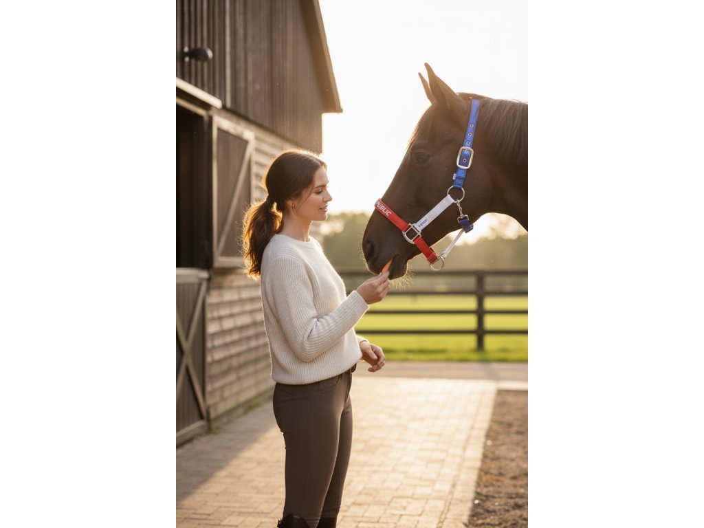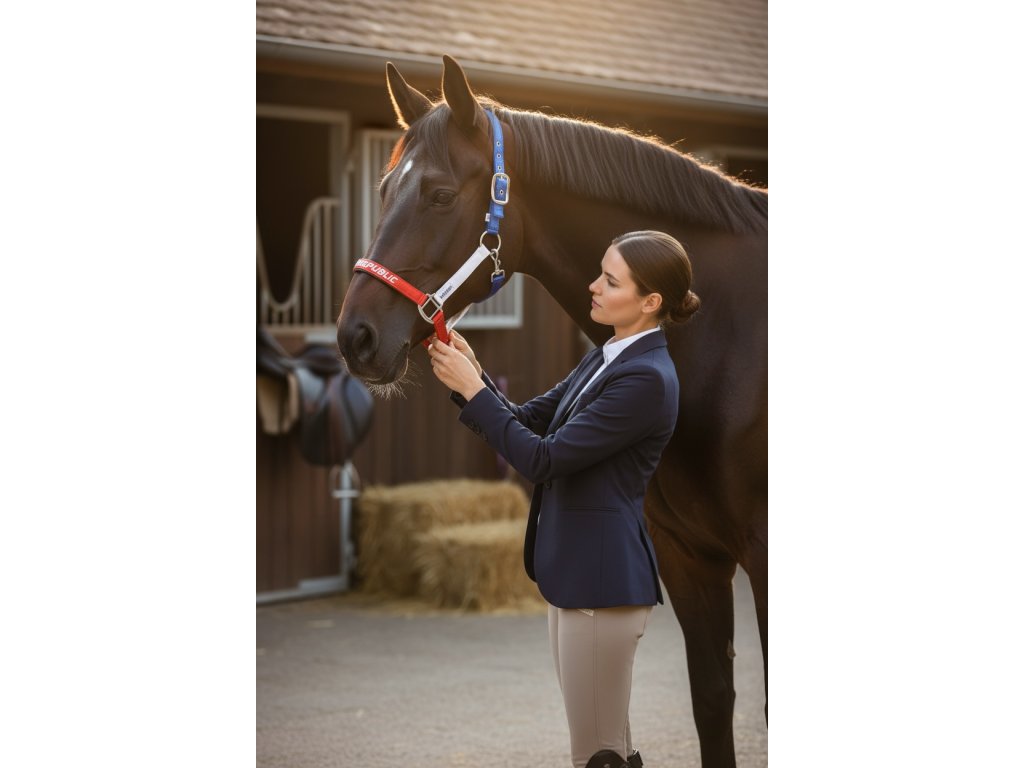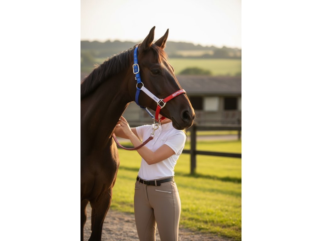 Odolná westernová ohlávka z pevného nylonu v barvách trikolóry. Výšivka CZECH REPUBLIC na nánosníku podtrhuje styl i národní hrdost.