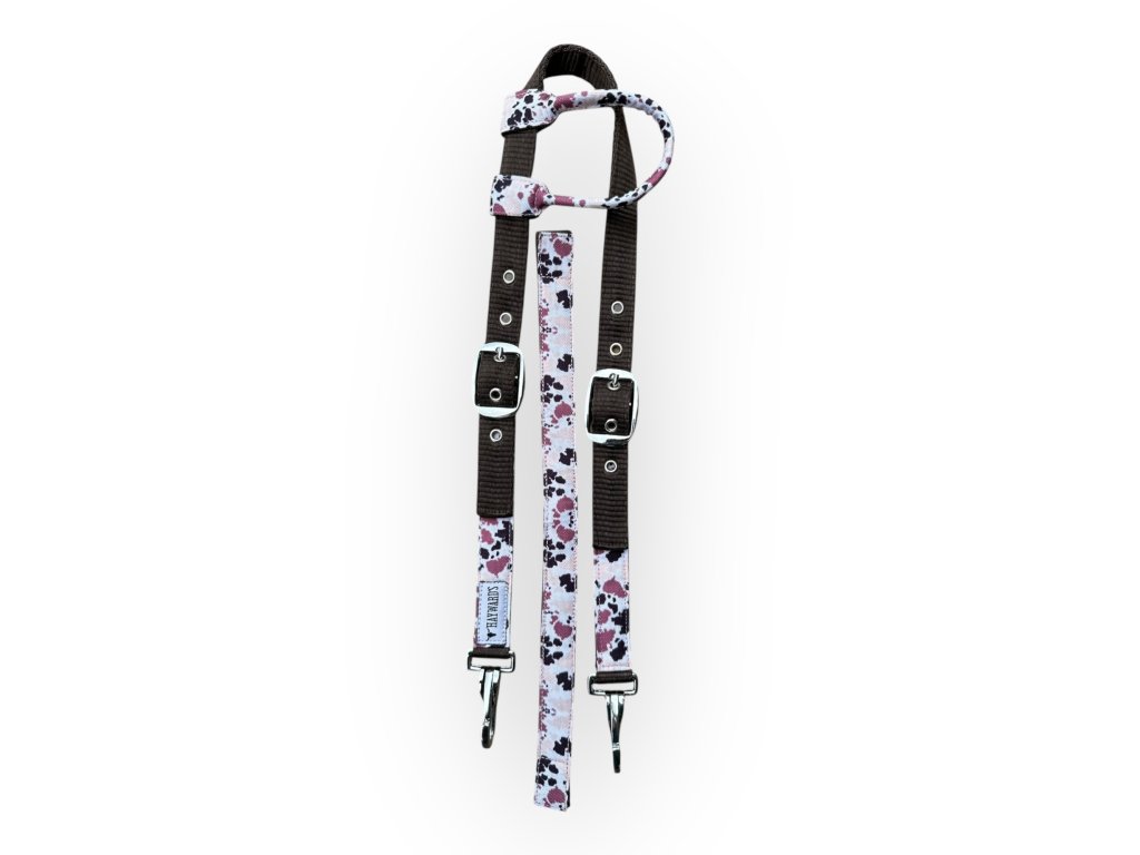 Stylová westernová uzda z nylonu Cowhide v tradičním hnědo-černo-bílém vzoru inspirovaném kravskou srstí. Lehká, odolná a snadno nastavitelná.