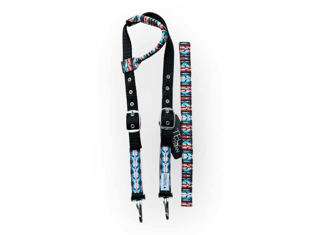 Stylová westernová uzda z nylonu Huntsville s černo-červeným vzorem a tyrkysovými detaily. Lehká, odolná a nastavitelná.