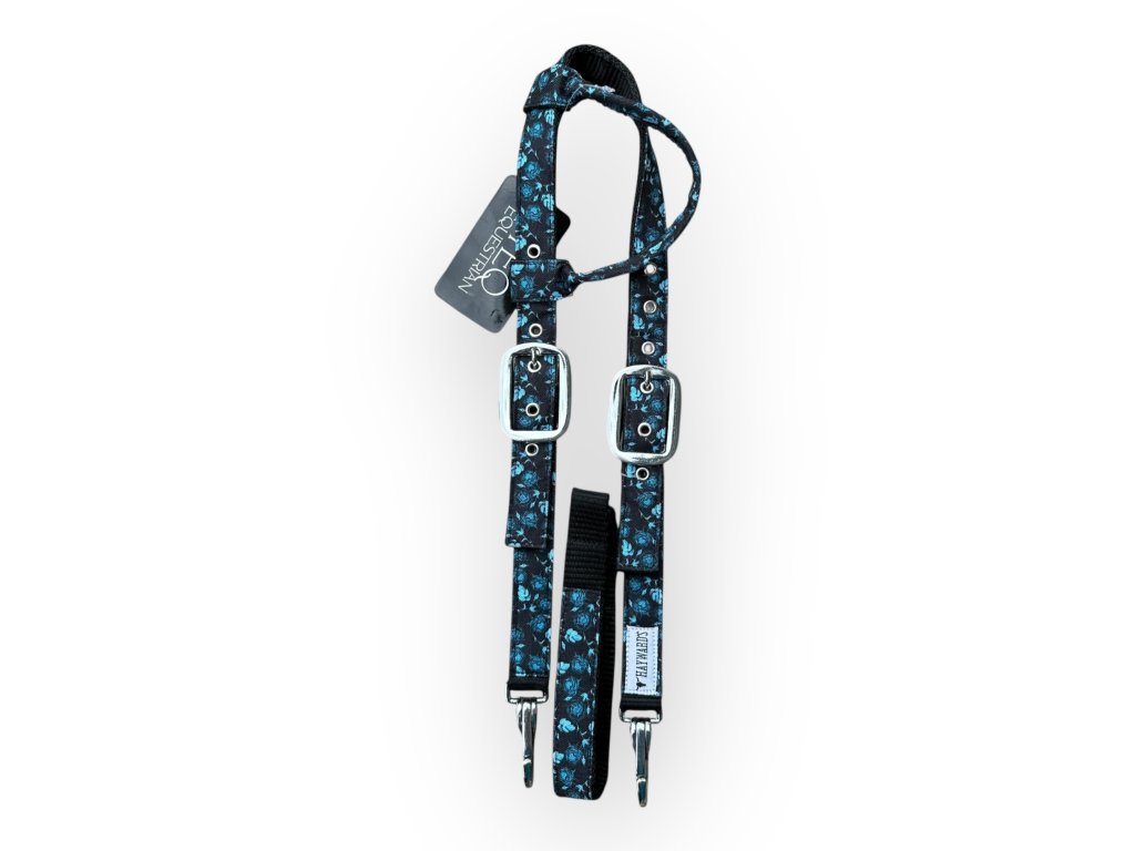 Originální westernová uzda z nylonu Texas Roses s černým podkladem a motivem modrých růží. Lehká, odolná a snadno nastavitelná.